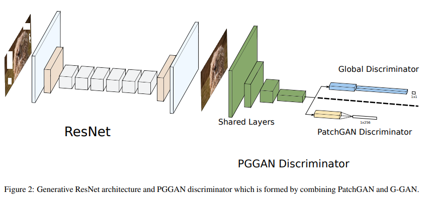 PGGAN은 먼저 G-GAN과 patchGAN간에 네트워크 계층을 공유 한 다음 경로를 분할하여 이미지 텍스처의 로컬 연속성과 이미지의 퍼지는(pervasive) 글로벌 기능을 모두 캡처하기 위해 생성기 네트워크에 공급하는 두 개의 적대적 손실을 생성합니다.