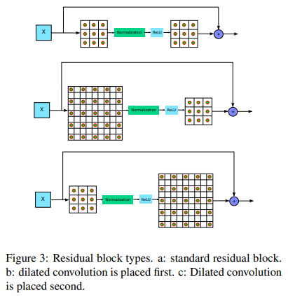 유형 a라고하는 첫 번째 residual block에는 정규화, 활성화 및 residual block이라는 두 개의 표준 회선만 포함됩니다. 다른 유형은 확장된 conv를 도입.