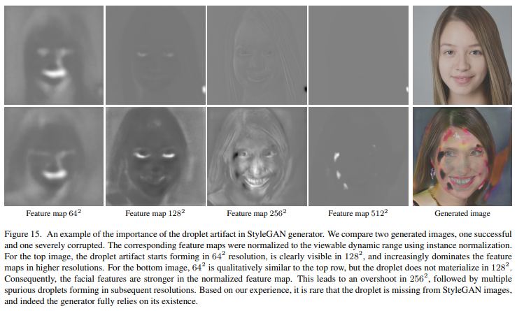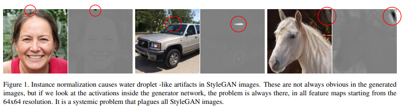 StyleGAN에 의해 생성된 대부분의 이미지가 물방울과 유사한 특징적인 얼룩 모양의 인공물을 나타내는 것을 관찰하는 것으로 시작합니다.