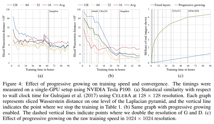 The speedup from progressive growing increases as the output resolution grows. Figure 4(c) shows training progress, measured in number of real images shown to the discriminator, as a function of training time when the training progresses all the way to 10242 resolution.