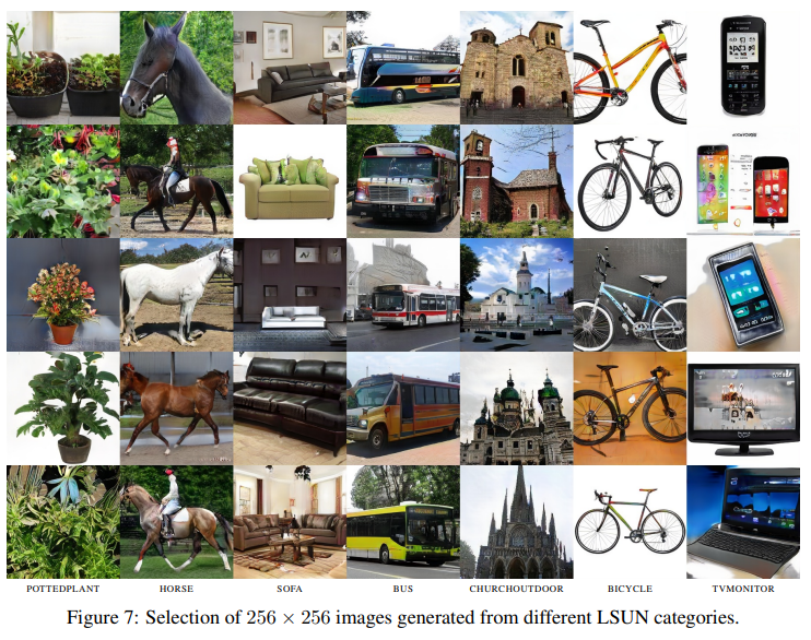 그림 7은 2562의 7 개의 매우 다른 LSUN 범주에서 선택한 예를 보여줍니다.