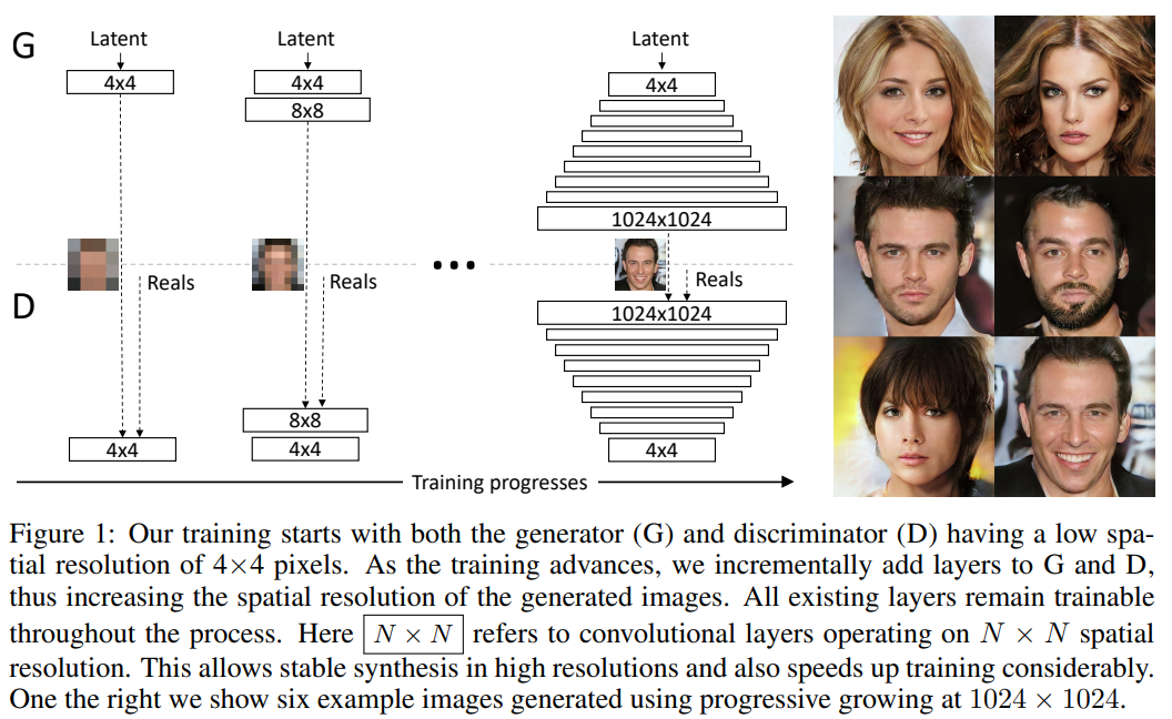 우리의 주요 기여는 저해상도 이미지로 시작한 다음 그림 1에서 시각화 된 것처럼 네트워크에 계층을 추가하여 해상도를 점진적으로 높이는 GAN을위한 교육 방법론입니다.