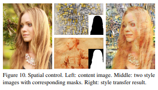 Gatys et al. [17] 색상 보존, 공간적 위치 및 스타일 전달의 규모를 제어하는 방법을 제안했습니다.