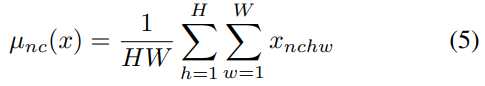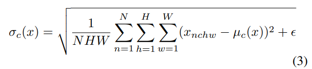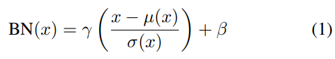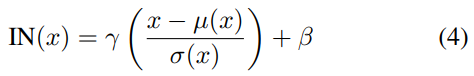 여기서 γ, β ∈ R C는 데이터에서 학습 한 유사 매개 변수입니다. µ (x), σ (x) ∈ R C는 각 기능 채널에 대해 독립적으로 배치 크기 및 공간 차원에서 계산 된 평균 및 표준 편차입니다.