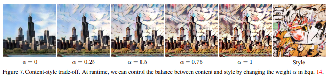 The degree of style transfer can be controlled during training by adjusting the style weight λ in Eqa. 11. In addition, our method allows content-style trade-off at test time by interpolating between feature maps that are fed to the decoder. Note that this is equivalent to interpolating between the affine parameters of AdaIN.