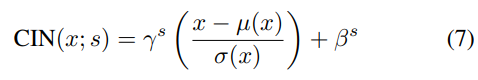 단일 세트의 아핀 매개 변수 γ 및 β를 학습하는 대신 A learned representation for artistic style. [11]은 각 스타일에 대해 서로 다른 매개 변수 집합 γs 및 βs를 학습하는 조건부 인스턴스 정규화 (CIN) 계층을 제안했습니다.