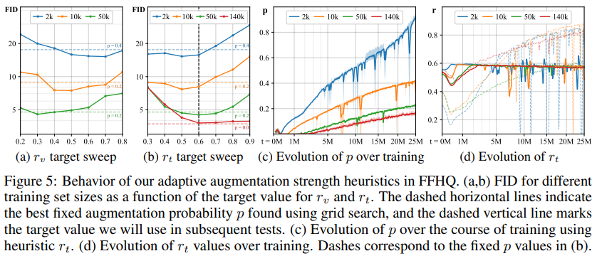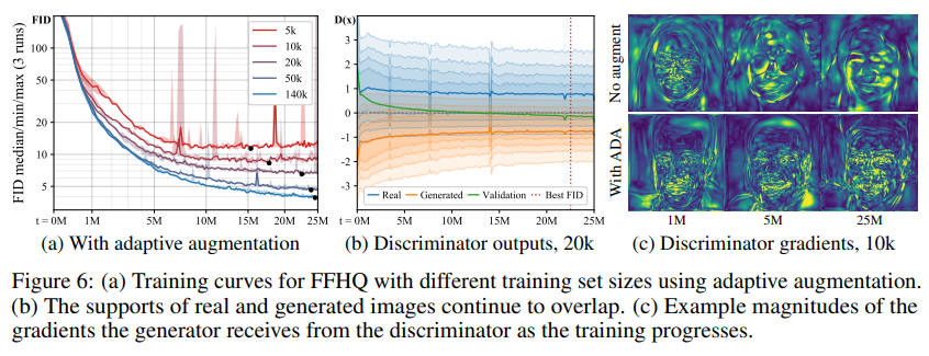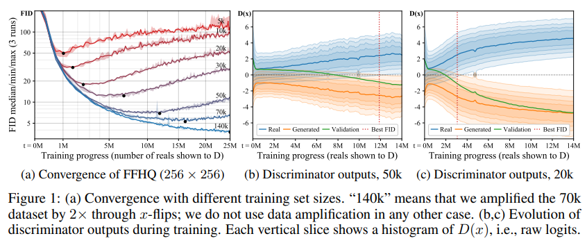 그림 1a는 FFHQ의 다양한 하위 집합에 대한 기준 결과를 보여줍니다. 훈련은 각 경우에 동일한 방식으로 시작되지만 결국 진행이 중지되고 FID가 상승하기 시작합니다. 훈련 데이터가 적을수록 더 빨리 발생합니다. 그림 1b, c는 훈련 중 실제 이미지와 생성 된 이미지에 대한 판별 기 출력 분포를 보여줍니다. 분포는 처음에는 겹치지 만 판별자가 점점 더 확실 해짐에 따라 계속 떨어져 표류하고 FID가 악화되기 시작하는 지점은 분포 간의 충분한 중복 손실과 일치합니다. 이는 별도의 검증 세트에 대해 측정 된 정확도의 저하로 더욱 입증되는 과적 합의 강력한 표시입니다. 우리는 차별자가 지나치게 자신감이 생기는 것을 방지하는 다목적 증강을 사용하여이 문제를 해결하는 방법을 제안합니다.