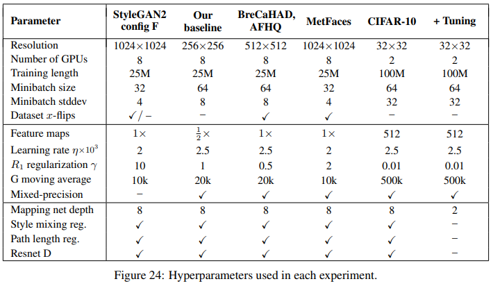 Figure 24 shows the hyperparameters that we used in our experiments, as well as the original StyleGAN2 config F [21]. We performed all training runs using 8 GPUs and continued the training until the discriminator had seen a total of 25M real images, except for CIFAR-10, where we used 2 GPUs and 100M images. We used minibatch size of 64 when possible, but reverted to 32 for METFACES in order to avoid running out of GPU memory. Similar to StyleGAN2, we evaluated the minibatch standard deviation layer independently over the images processed by each GPU.