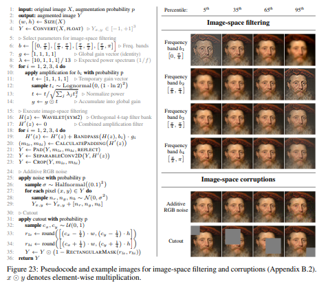 우리의 구현에서, 우리는 모든 그룹화 된 증강에 의해 구현 된 전체 아핀 변환을 나타내는 벡터와 행렬로 변환 체인을 축적 한 다음 이미지에 적용함으로써 이러한 문제를 최대한 완화합니다. 이것은 우리가 사용하는 모든 증강이 이미지 (또는 색상) 공간에서 아핀 변환이기 때문에 가능합니다. 또한 기하학적 변환을 적용하기 전에 이미지에 반사 패딩을 적용하고 해상도를 두 배로 조정합니다 (반대로 나중에 자르고 축소). 효과적으로 이미지는 적절하게 반사 된 더 미세한 해상도 사본의 무한 타일링으로 처리되며 실제 대상 해상도 크롭은 증가 시간에만 샘플링됩니다.