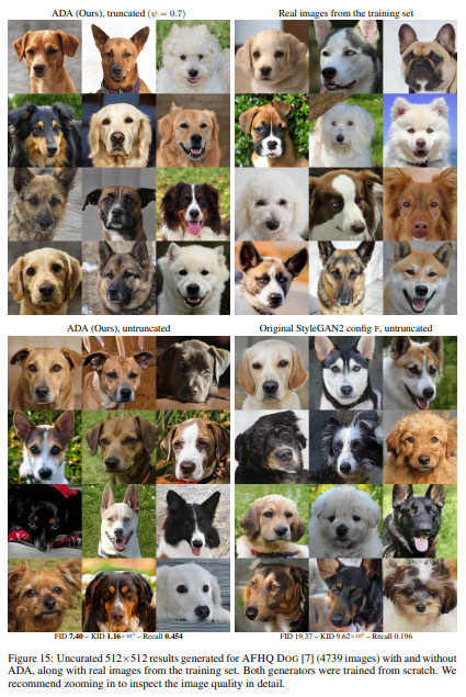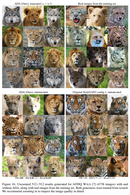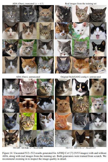 너무 적은 데이터를 사용하여 GAN (Generative Adversarial Network)을 훈련하면 일반적으로 판별자가 과적 합되어 훈련이 분산됩니다. 제한된 데이터 영역에서 훈련을 상당히 안정화시키는 적응 형 판별 자 증강 메커니즘을 제안합니다. 이 접근 방식은 손실 기능이나 네트워크 아키텍처를 변경할 필요가 없으며 처음부터 훈련 할 때와 다른 데이터 세트에서 기존 GAN을 미세 조정할 때 모두 적용 할 수 있습니다. 우리는 여러 데이터 세트에서 이제 수천 개의 학습 이미지만으로도 좋은 결과를 얻을 수 있으며 종종 StyleGAN2 결과를 수십 배 더 적은 이미지와 일치시킵니다. 우리는 이것이 GAN을위한 새로운 애플리케이션 도메인을 열 것으로 기대합니다. 또한 널리 사용되는 CIFAR-10은 실제로 제한된 데이터 벤치 마크이며 레코드 FID를 5.59에서 2.42로 개선했습니다.
