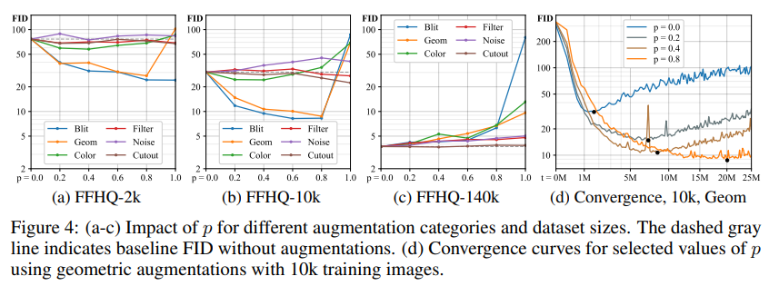 Given that there are many augmentations in the pipeline, even fairly small values of p make it very unlikely that the discriminator sees a clean image (Figure 2c).