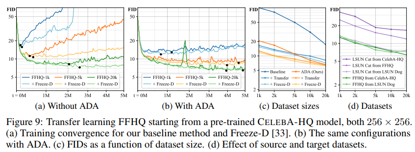 Mo et al. [33] 전이 학습 결과를 개선하기 위해 판별 기의 처음 k 개 레이어를 동결하는 것을 제안합니다. 우리는 k에 대해 몇 가지 다른 선택을 테스트했습니다. 최상의 결과는 그림 9에서 k = 10, 그림 11b에서 k = 13으로 주어졌습니다. 실제로 이것은 각각 3 개 또는 4 개의 가장 높은 해상도에서 작동하는 모든 레이어를 동결하는 것에 해당합니다.