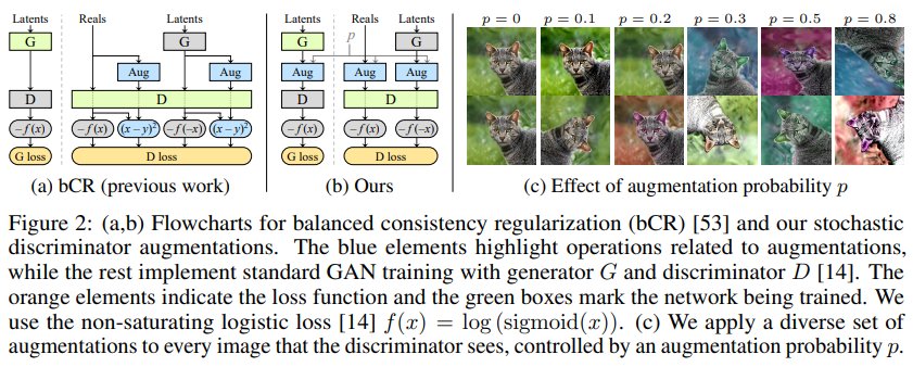 우리의 솔루션은 식별기에 표시되는 모든 이미지에 일련의 증강을 적용한다는 점에서 bCR과 유사합니다. 그러나 별도의 CR 손실 항을 추가하는 대신 증강 이미지 만 사용하여 판별자를 평가하고 생성기를 훈련 할 때도이를 수행합니다 (그림 2b). 따라서 확률 적 판별 자 증가라고하는이 접근 방식은 매우 간단합니다. 그러나이 가능성은 거의 주목을받지 못했습니다. 아마도 언뜻보기에 그것이 작동하는지 확실하지 않기 때문일 것입니다. 판별자가 훈련 이미지가 실제로 어떻게 보이는지 전혀 알지 못하는 경우 생성기를 올바르게 안내 할 수 있는지 여부가 명확하지 않습니다 (그림 2c). 따라서 먼저이 접근 방식이 생성 된 이미지에 대한 증가를 유출하지 않는 조건을 조사한 다음 이러한 변환에서 전체 파이프 라인을 구축합니다.