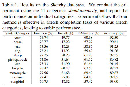 In this section, we show sketch completion results of the mentioned 11 object categories. Table 1 shows the quantitative performance of different categories in the Sketchy database. Each category contains about 550 sketches, and we make one corrupted sketch for each original sketch. Thus, the total numbers of training and testing corrupted sketches for all the 11 categories are 6,196 and 1,184, respectively.