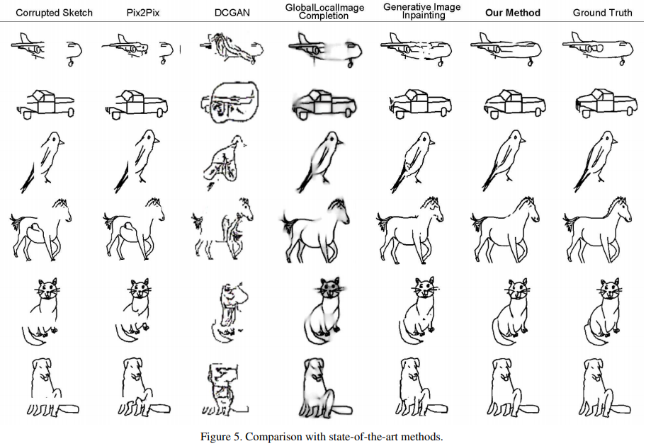Table 5 shows the quantitative evaluation of our method and the state-of-the-art methods. Figure 5 shows examples for visual comparison. Our network is superior to the baselines in sketch completion in terms of completion performance and visual results. Compared with Pix2Pix [21], our method produces better results in terms of contour connectedness. DCGAN [40] usually produces blurry sketches. For the two state-of-the-art inpainting methods designed for images, they often produce wrong strokes.