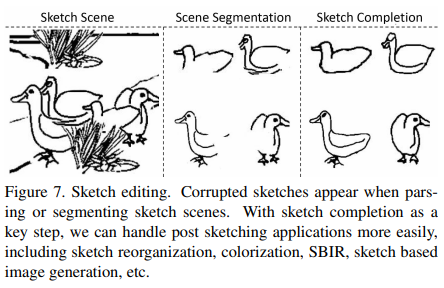Hand-drawn sketches are usually incomplete in scenarios such as overlapping sketches for a scene with multiple objects, interim sketches, or corrupted sketches due to image segmentation. Neither the well-known sketch2photo problem [7] or the current sketch recognition studies have considered or handled the situations where corrupted sketches are provided, which brings huge obstacles and limitations to post sketching applications. Here we use our sketch completion method as an intermediate step which offers a new mode of sketch applications (See Figure 7).