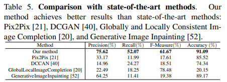 We compare our method with state-of-the-art methods: Pix2Pix [21], DCGAN [40], GlobalLocalImageCompletion [20], Generative Image Inpainting [52]. Pix2Pix and DCGAN are GAN-based methods, and GlobalLocalImageCompletion and Generative Image Inpainting are image inpainting methods.