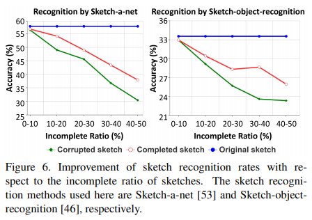 Moreover, we have found that the improvement of sketch recognition rate is largely influenced by the incomplete ratio of the corrupted data. When the incomplete ratio is relatively low, the current sketch recognition methods can cope with such input data quite robustly, but these methods cannot maintain the same level of performance as the incomplete ratio increases. In such cases, our sketch completion helps improve the recognition performance significantly. Here we conduct an incomplete sketch recognition experiment using two well-known sketch recognition methods: Sketch-a-net [53] and Sketch-object-recognition [46]. Figure 6 shows the sketch recognition performance w.r.t. varying incomplete ratio of sketches, indicating that our incomplete sketch recognition approach is universal for improving general sketch recognition methods. Using our sketch completion method as an intermediate step of the incomplete sketch recognition task can enhance the recognition accuracy significantly, especially for sketches corrupted seriously.