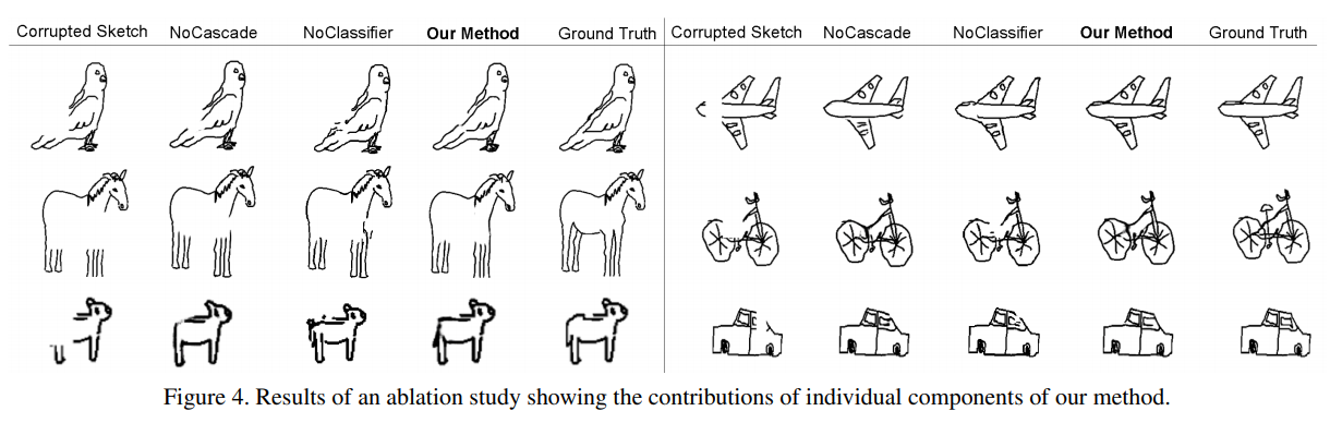 Compared to conventional photo-oriented DNNs such as Pix2Pix and DCGANs, our SketchGAN has two distinct features (see Section 3): (i) the cascade network architecture, (ii) the strategy of utilizing the auxiliary sketch recognition network. In this section we evaluate the contributions of each feature. Specifically, we examine three ablative versions of our full model: SketchGAN with all features but no cascade (No Cascade), SketchGAN with all features but no auxiliary sketch recognition network (No Classifier), i.e. there are no class labels and the data of 11 categories are trained and tested together, and SketchGAN with all features. We show the sketch completion results in Figure 4 for visual analysis. And the results in Table 2 show that both strategies contribute to the final strong performance of SketchGAN. In particular, (i) from the visual results, more broken lines and intermediate completed sketches are likely to be produced without the proposed cascade strategy, and the cascade strategy leads to better completion results on large corrupted regions. (ii) The auxiliary sketch recognition network improves the sketch completion greatly when multi-class objects exist by offering strong category priors. Experiments demonstrate that our sketch completion method can achieve reliable sketch completion results. The cascade strategy helps to make the completed sketches maintain contour closure, and the completion results tend to be distorted without the sketch recognition auxiliary network.