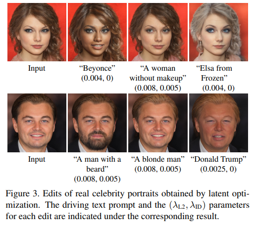 A simple approach for leveraging CLIP to guide image manipulation is through direct latent code optimization. Specifically, given a source latent code ws ∈ W+, and a directive in natural language, or a text prompt t, we solve the following optimization problem: arg min w∈W+ DCLIP(G(w), t) + λL2 kw − wsk2 + λIDLID(w), (1) where G is a pretrained StyleGAN1 generator and DCLIP is the cosine distance between the CLIP embeddings of its two arguments. Similarity to the input image is controlled by the L2 distance in latent space, and by the identity loss [38]: LID (w) = 1 − hR(G(ws)), R(G(w))i, (2) where R is a pretrained ArcFace [7] network for face recognition, and h·, ·i computes the cosine similarity between it’s arguments. We solve this optimization problem through gradient descent, by back-propagating the gradient of the objective in (1) through the pretrained and fixed StyleGAN generator G and the CLIP image encoder. In Figure 3 we provide several edits that were obtained using this optimization approach after 200-300 iterations. The input images were inverted by e4e [46]. Note that visual characteristics may be controlled explicitly (beard, blonde) or implicitly, by indicating a real or a fictional person (Beyonce, Trump, Elsa). The values of λL2 and λID depend on the nature of the desired edit. For changes that shift towards another identity, λID is set to a lower value.