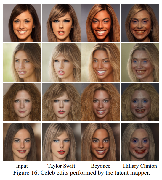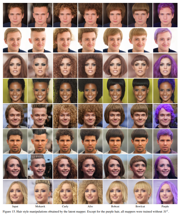 In this section we provide additional results to those presented in the paper. Specifically, we begin with a variety of image manipulations obtained using our latent mapper. All manipulated images are taken from the CelebA-HQ and were inverted by e4e [46]. In Figure 15 we show a large gallery of hair style manipulations. In Figures 16 and 17 we show “celeb” edits, where the input image is manipulated to resemble a certain target celebrity. In Figure 18 we show a variety of expression edits.