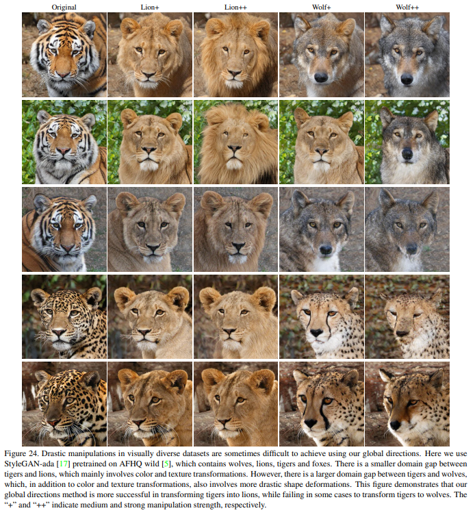 Figure 23 shows an additional comparison between textdriven manipulation using our global directions method and our latent mapper. Our observations are similar to the ones we made regarding Figure 10 in the main paper. Finally, Figure 24 demonstrates that drastic manipulations in visually diverse datasets are sometimes difficult to achieve using our global directions. Here we use StyleGAN-ada [17] pretrained on AFHQ wild [5], which contains wolves, lions, tigers and foxes. There is a smaller domain gap between tigers and lions, which mainly involves color and texture transformations. However, there is a larger domain gap between tigers and wolves, which, in addition to color and texture transformations, also involves more drastic shape deformations. This figure demonstrates that our global directions method is more successful in transforming tigers into lions, while failing in some cases to transform tigers to wolves.