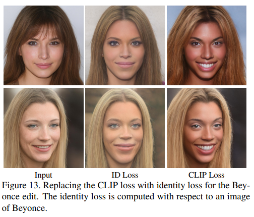 CLIP에서 "명사 편집"을 사용하는 고유성을 보여주기 위해 다음과 같은 실험을 수행합니다. CLIP 손실을 사용하는 대신 원하는 유명인의 단일 이미지에 대해 ID 손실을 사용합니다. 구체적으로 비욘세의 이미지를 사용하여이 실험을 수행합니다. 그 결과는 그림 13에 나와 있습니다. 볼 수 있듯이 CLIP는 단순히 얼굴 인식 네트워크를 사용하여 달성 할 수없는 고유 한 편집을 수행하도록 매퍼를 안내합니다.