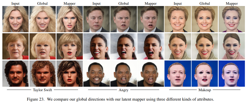 In Figure 10, we show a comparison between our global direction method and several state-of-the-art StyleGAN image manipulation methods: GANSpace [13], InterFaceGAN [41], and StyleSpace [50]. The comparison only examines the attributes which all of the compared methods are able to manipulate (Gender, Grey hair, and Lipstick), and thus it does not include the many novel manipulations enabled by our approach. Since all of these are common attributes, we do not include our mapper in this comparison. Following Wu et al. [50], the manipulation step strength is chosen such that it induces the same amount of change in the logit value of the corresponding classifiers (pretrained on CelebA). It may be seen that in GANSpace [13] manipulation is entangled with skin color and lighting, while in InterFaceGAN [41] the identity may change significantly (when manipulating Lipstick). Our manipulation is very similar to StyleSpace [50], which only changes the target attribute, while all other attributes remain the same. In the supplementary material, we also show a comparison with StyleFLow [1], a state-of-the-art non-linear method. Our method produces results of similar quality, despite the fact that StyleFlow simultaneously uses several attribute classifiers and regressors (from the Microsoft face API), and is thus can manipulate a limited set of attributes. In contrast, our method requires no extra supervision.