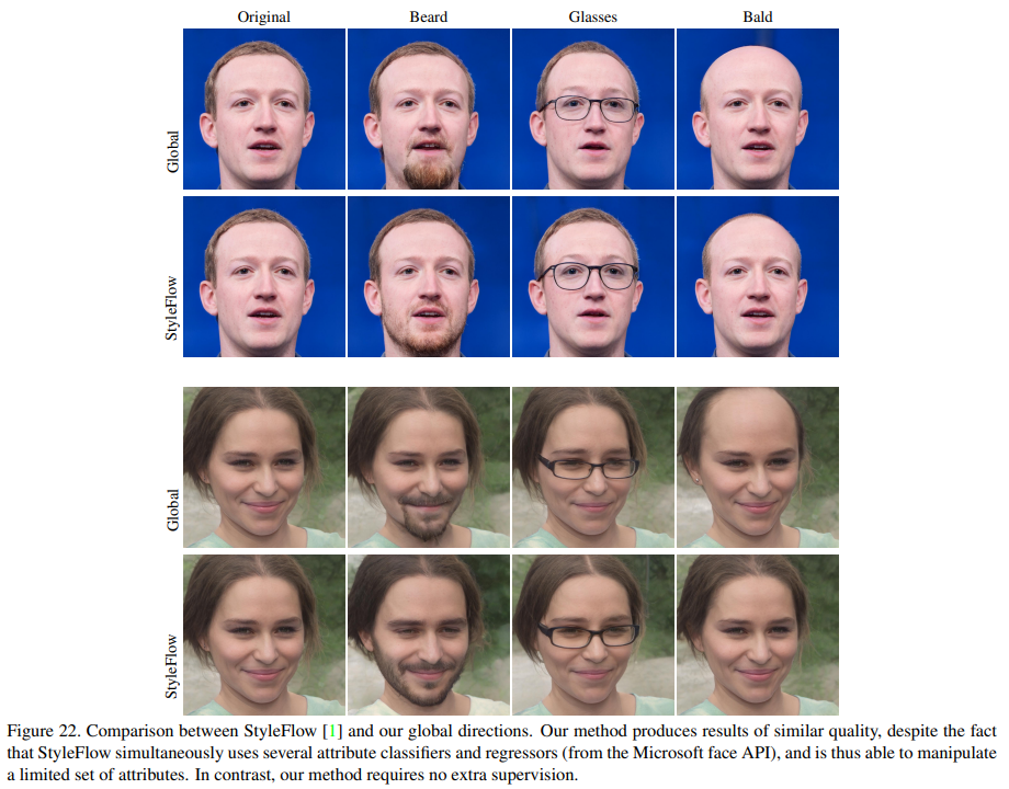 Figure 22 shows a comparison between StyleFlow [1] and our global directions method. It may be seen that our method is able to produce results of comparable visual quality, despite the fact that StyleFlow requires the simultaneous use of several attribute classifiers and regressors (from the Microsoft face API), and is thus able to manipulate a limited set of attributes. In contrast, our method required no extra supervision to produce these and all of the other manipulations demonstrated in this work.