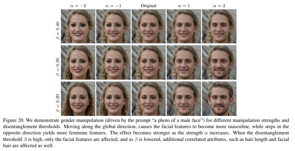 Figure 20 shows image manipulations driven by the prompt “a photo of a male face” for different manipulation strengths and disentanglement thresholds. Moving along the global direction, causes the facial features to become more masculine, while steps in the opposite direction yields more feminine features. The effect becomes stronger as the strength α increases. When the disentanglement threshold β is high, only the facial features are affected, and as β is lowered, additional correlated attributes, such as hair length and facial hair are affected as well.