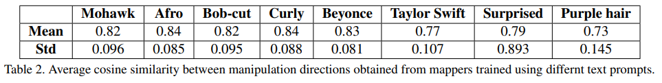 Our mapper is trained to manipulate the desired attributes of the image as indicated by the text prompt t, while preserving the other visual attributes of the input image. The CLIP loss, LCLIP(w) guides the mapper to minimize the cosine distance in the CLIP latent space: LCLIP(w) = DCLIP(G(w + Mt(w)), t), (4) where G denotes again the pretrained StyleGAN generator. To preserve the visual attributes of the original input image, we minimize the L2 norm of the manipulation step in the latent space. Finally, for edits that require identity preservation, we use the identity loss defined in eq. (2). Our total loss function is a weighted combination of these losses: L(w) = LCLIP(w) + λL2 kMt(w)k2 + λIDLID(w). (5) As before, when the edit is expected to change the identity, we do not use the identity loss. The parameter values we use for the examples in this paper are λL2 = 0.8, λID = 0.1, except for the “Trump” manipulation in Figure 9, where the parameter values we use are λL2 = 2, λID = 0. In Figure 4 we provide several examples for hair style edits, where a different mapper used in each column. In all of these examples, the mapper succeeds in preserving the identity and most of the other visual attributes that are not related to hair. Note, that the resulting hair appearance is adapted to the individual; this is particularly apparent in the “Curly hair” and “Bob-cut hairstyle” edits. It should be noted that the text prompts are not limited to a single attribute at a time. Figure 5 shows four different combinations of hair attributes, straight/curly and short/long, each yielding the expected outcome. This degree of control has not been demonstrated by any previous method we’re aware of. Since the latent mapper infers a custom-tailored manipulation step for each input image, it is interesting to examine the extent to which the direction of the step in latent space varies over different inputs. To test this, we first invert the test set of CelebA-HQ [28, 15] using e4e [46]. Next, we feed the inverted latent codes into several trained mappers and compute the cosine similarity between all pairs of the resulting manipulation directions. The mean and the standard deviation of the cosine similarity for each mapper is reported in Table 2. The table shows that even though the mapper infers manipulation steps that are adapted to the input image, in practice, the cosine similarity of these steps for a given text prompt is high, implying that their directions are not as different as one might expect.