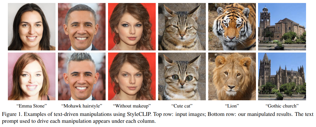 In this work, we explore leveraging the power of recently introduced Contrastive Language-Image Pre-training (CLIP) models in order to enable intuitive text-based semantic image manipulation that is neither limited to preset manipulation directions, nor requires additional manual effort to discover new controls. The CLIP model is pretrained on 400 million image-text pairs harvested from the Web, and since natural language is able to express a much wider set of visual concepts, combining CLIP with the generative power of StyleGAN opens fascinating avenues for image manipulation. Figures 1 shows several examples of unique manipulations produced using our approach. Specifically, in this paper we investigate three techniques that combine CLIP with StyleGAN: 1. Text-guided latent optimization, where a CLIP model is used as a loss network [14]. This is the most versatile approach, but it requires a few minutes of optimization to apply a manipulation to an image. 2. A latent residual mapper, trained for a specific text prompt. Given a starting point in latent space (the input image to be manipulated), the mapper yields a local step in latent space. 3. A method for mapping a text prompt into an inputagnostic (global) direction in StyleGAN’s style space, providing control over the manipulation strength as well as the degree of disentanglement. The results in this paper and the supplementary material demonstrate a wide range of semantic manipulations on images of human faces, animals, cars, and churches. These manipulations range from abstract to specific, and from extensive to fine-grained. Many of them have not been demonstrated by any of the previous StyleGAN manipulation works, and all of them were easily obtained using a combination of pretrained StyleGAN and CLIP models.