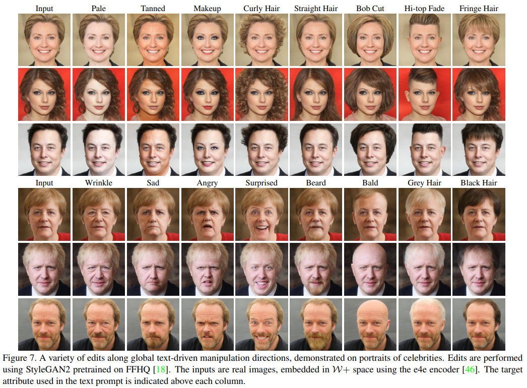 StyleGAN의 강력한 생성 능력과 CLIP의 뛰어난 시각적 개념 인코딩 능력을 결합한 세 가지 새로운 이미지 조작 방법을 도입했습니다. 우리는 이러한 기술이 다양한 고유 한 이미지 조작을 가능하게한다는 것을 보여주었습니다.이 중 일부는 주석이 달린 데이터에 의존하는 기존 방법으로는 달성 할 수 없습니다. 또한 CLIP이 원하는 헤어 스타일을 지정하는 등 세밀한 편집 컨트롤을 제공하는 반면, 우리의 방법은 조작 강도와 엉킴 정도를 제어 할 수 있음을 보여주었습니다. 요약하면 텍스트 기반 조작은 강력한 이미지 편집 도구이며 그 능력과 중요성은 계속해서 증가 할 것입니다.