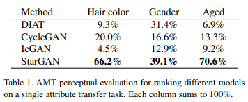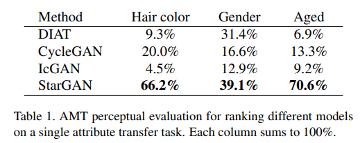 StarGAN은 모든 경우에 가장 좋은 속성을 전달하기 위해 다수의 표를 얻었습니다.