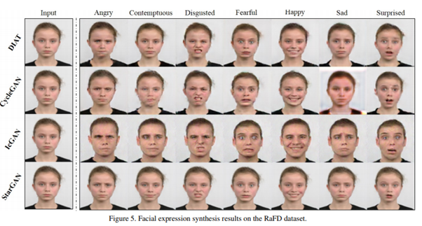 그림 5에서 볼 수 있듯이 StarGAN은 입력의 개인 정체성과 얼굴 특징을 적절하게 유지하면서 가장 자연스러운 표정을 명확하게 생성합니다.