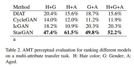 그러나 표 2의 'G + A'사례와 같은 다중 속성 변경에서는 성능 차이가 현저하게 나타납니다 (예 : StarGAN의 경우 49.8 %, IcGAN의 경우 20.3 %).보다 복잡한 경우 StarGAN의 장점을 명확하게 보여줍니다. , 다중 속성 전송 작업.