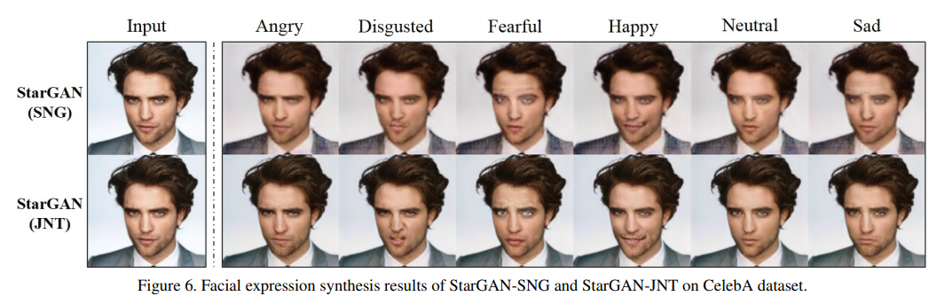 그림 6은 StarGAN-SNG와 StarGAN-JNT의 질적 비교를 보여줍니다. 여기서 작업은 CelebA에서 이미지의 얼굴 표정을 합성하는 것입니다.