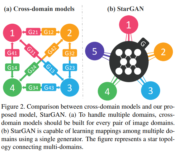 이들의 비효율성은 k 도메인 간의 모든 매핑을 학습하려면 k (k-1) 생성기를 훈련해야한다는 사실에서 기인합니다. 그림 2 (a)는 4 개의 서로 다른 도메인간에 이미지를 변환하기 위해 12 개의 개별 생성기 네트워크를 훈련해야하는 방법을 보여줍니다.