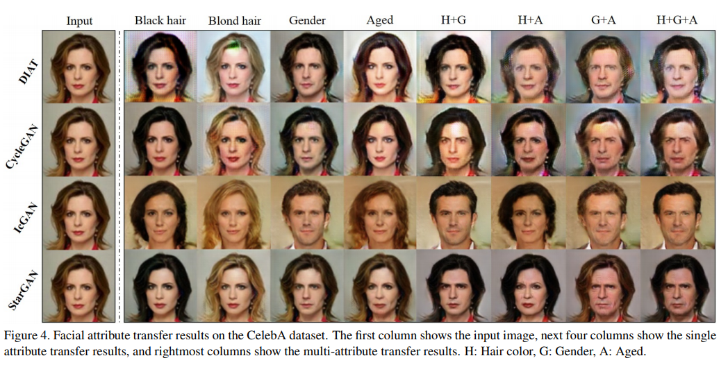 가능한 모든 속성 값 쌍을 고려하여 DIAT 및 CycleGAN과 같은 교차 도메인 모델을 여러 번 훈련합니다. DIAT 및 CycleGAN의 경우 다단계 번역을 수행하여 여러 속성을 합성합니다 (예 : 머리 색깔 변경 후 성별 속성 전송).-