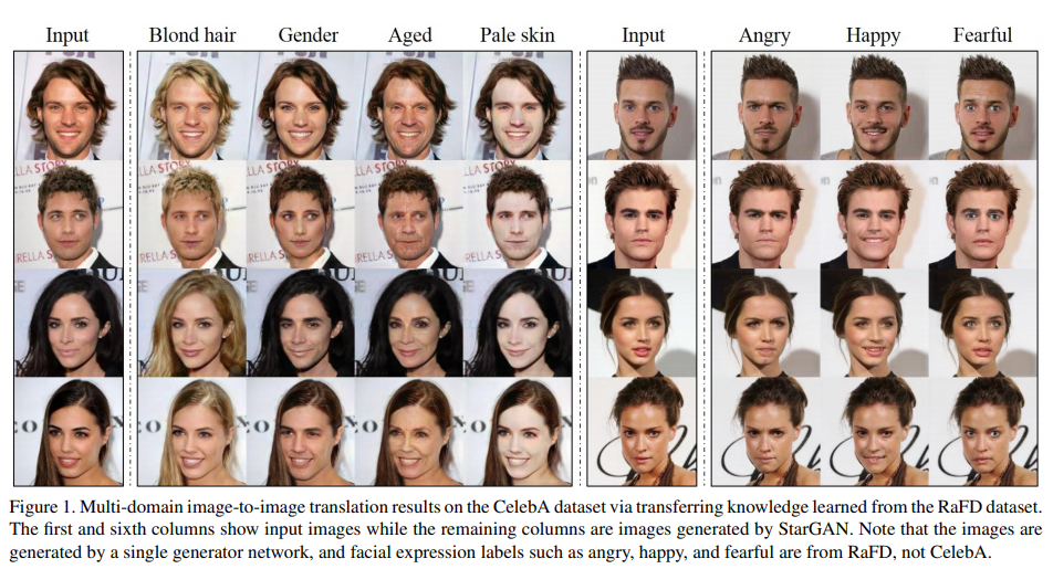 본 논문에서는 단일 생성기와 판별기를 사용하여 여러 도메인간에 확장 가능한 이미지-이미지 변환 모델 인 StarGAN을 제안했습니다.